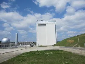そして大型ロケット発射台(左)と、発射台につながるロケット格納庫(右)