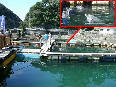 そこでイルカを飼っています。 (写真のイルカの他に、囲いの外にもいる。)