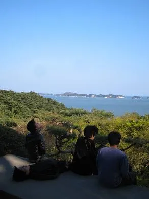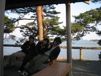 松島の展望台にいた話の長いおじさんに何かを伝えようとしているよしろう