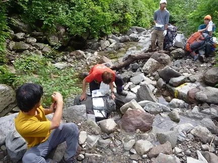 (左)岩場が多く、ナキウサギの声が木霊していた。(右)コマドリ沢分岐近くでザックを川に落とした米(皆からは歓声が)
