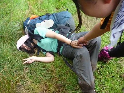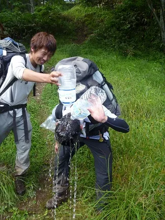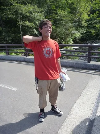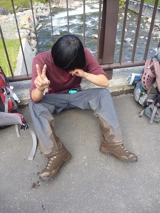 (左)長かった旅路も最終地点へ。やってきましたトムラウシ温泉!!(右)余りの感動に倒れるTKHR