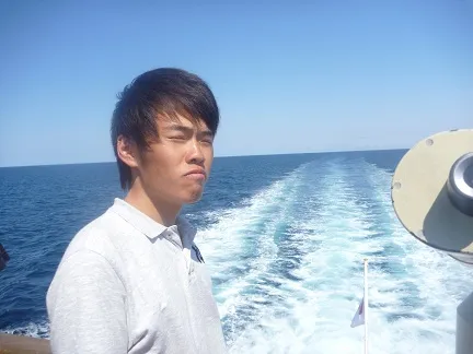 (左)知床のフェリーの上で。潮風が目にしみる。(右)米も元気そう