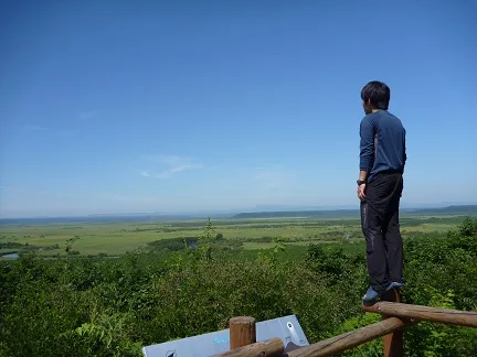 (左)知床斜里で米と別れる。我々からはボロクソにいわれてました。(右)釧路湿原を眺めるすずえもん。